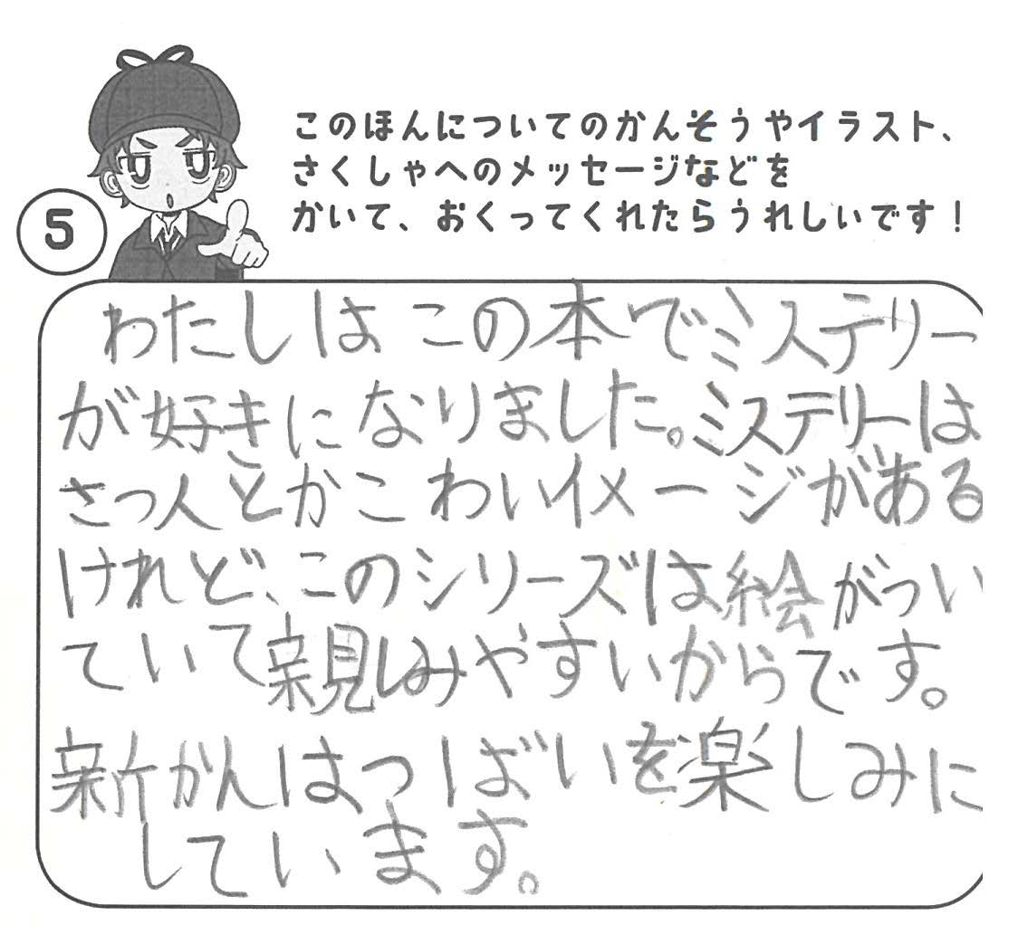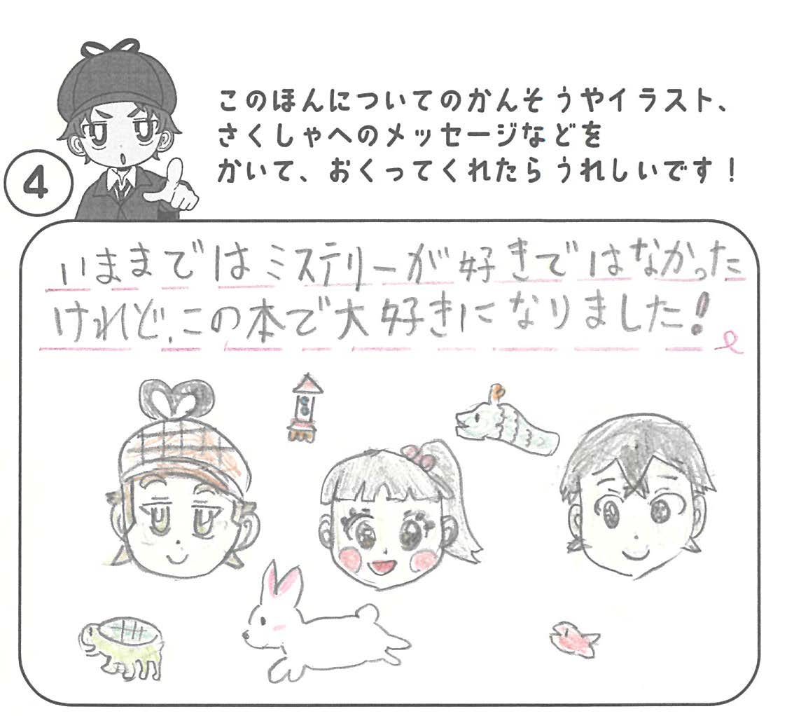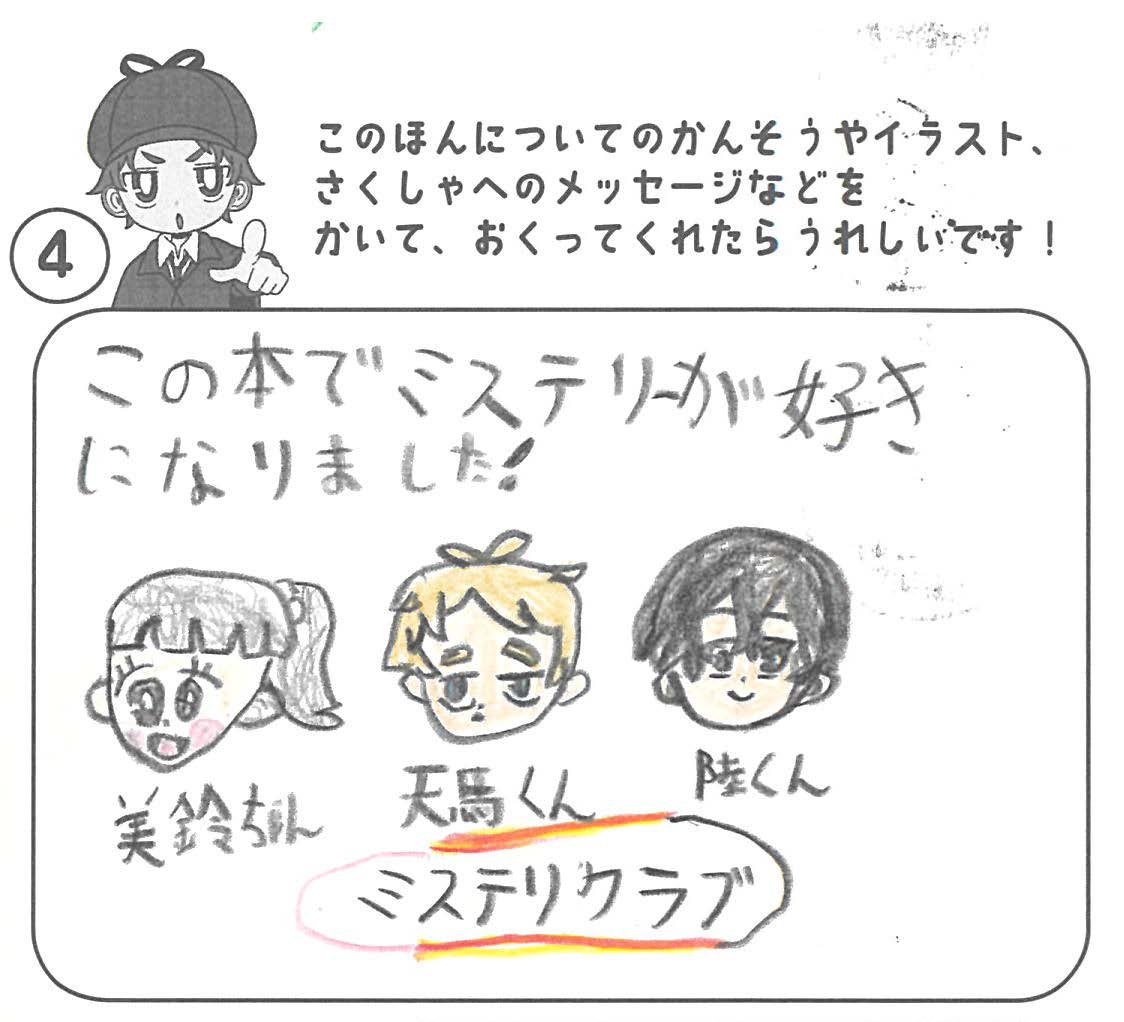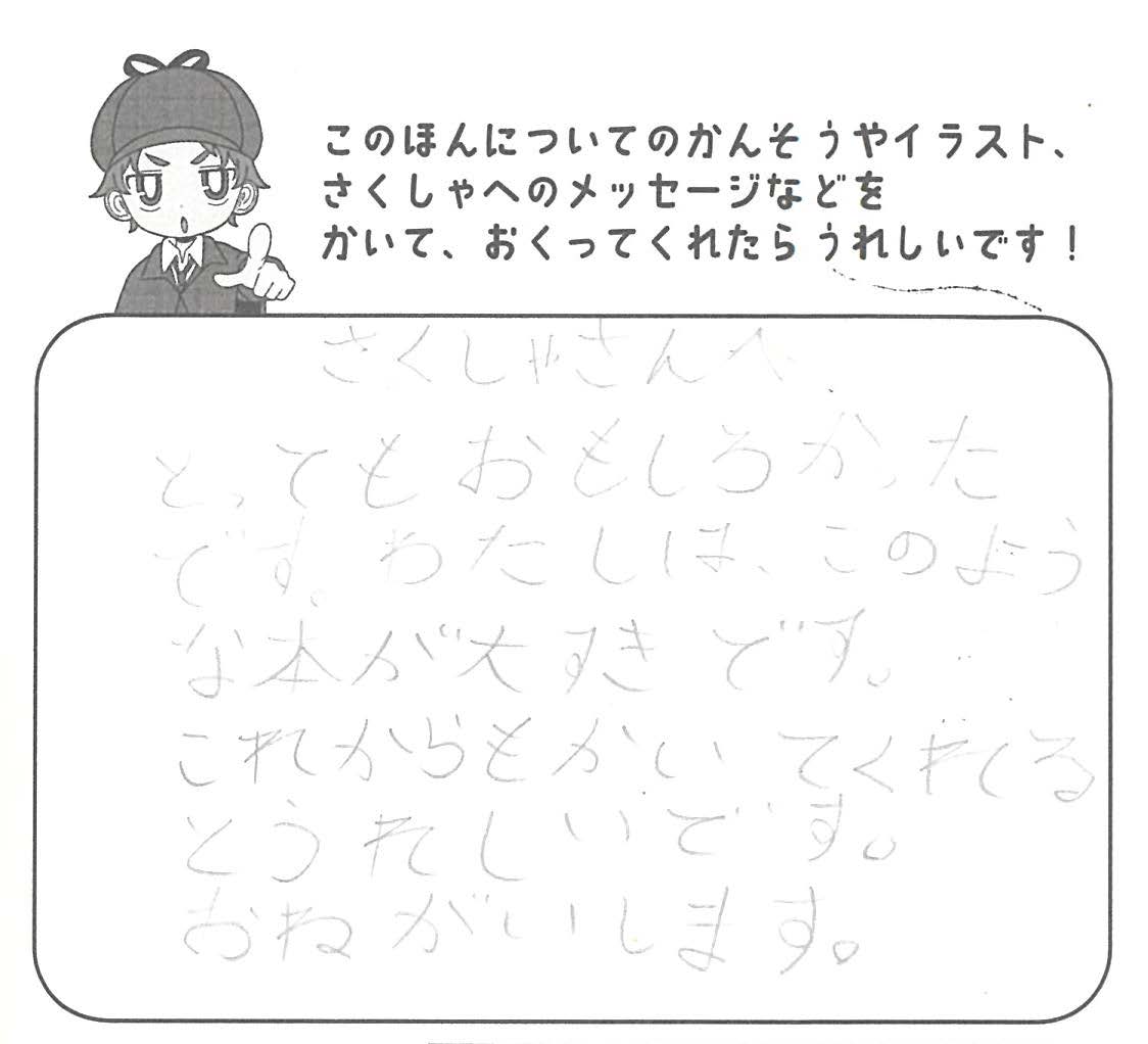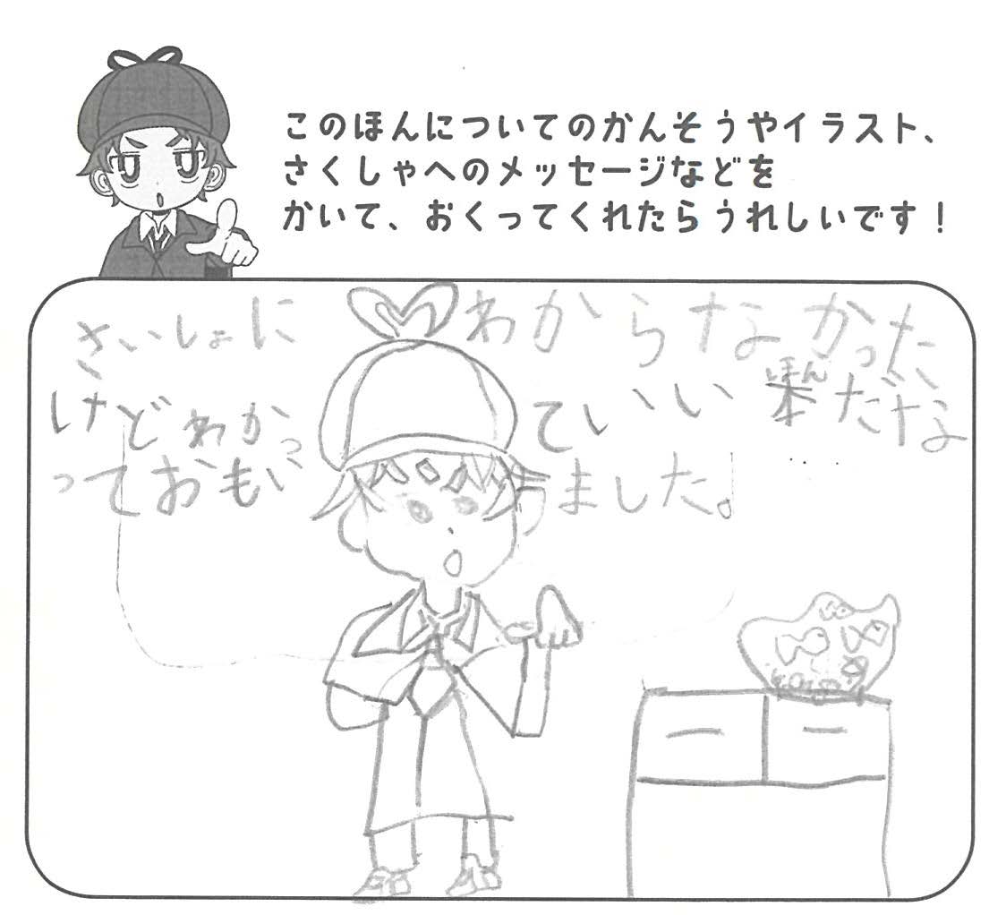 シリーズ予告もあり、嬉しいです。ミステリファンとしては、ゆくゆくは大どんでん返しや叙述トリックなども読めるだろうかとだいぶ先走った期待もしてしまいます。低年齢向けの児童書ではさすがに難しいかとも思いますが。