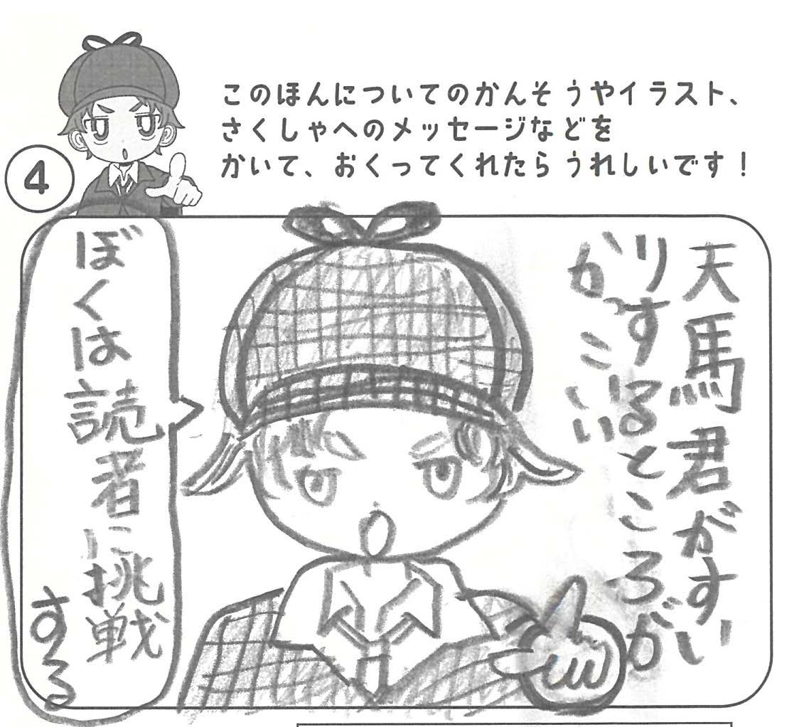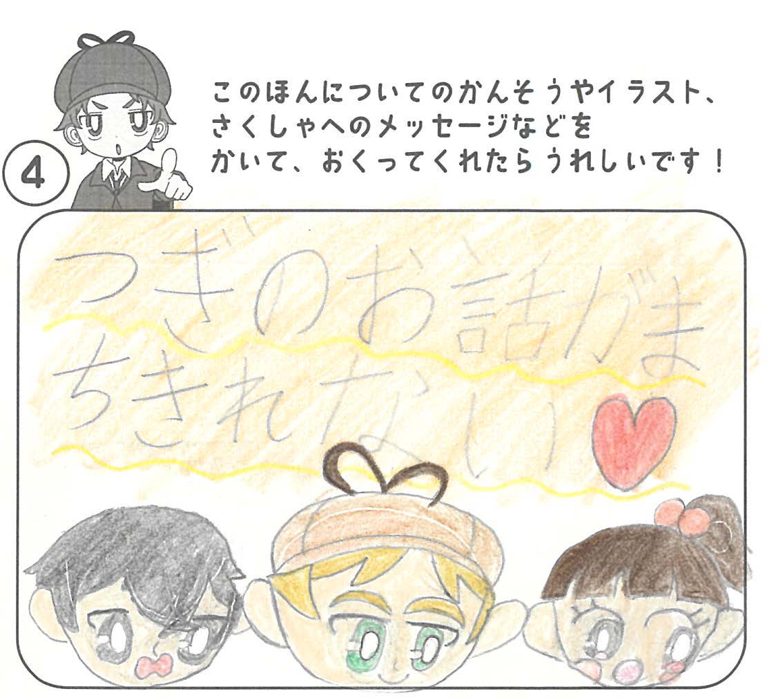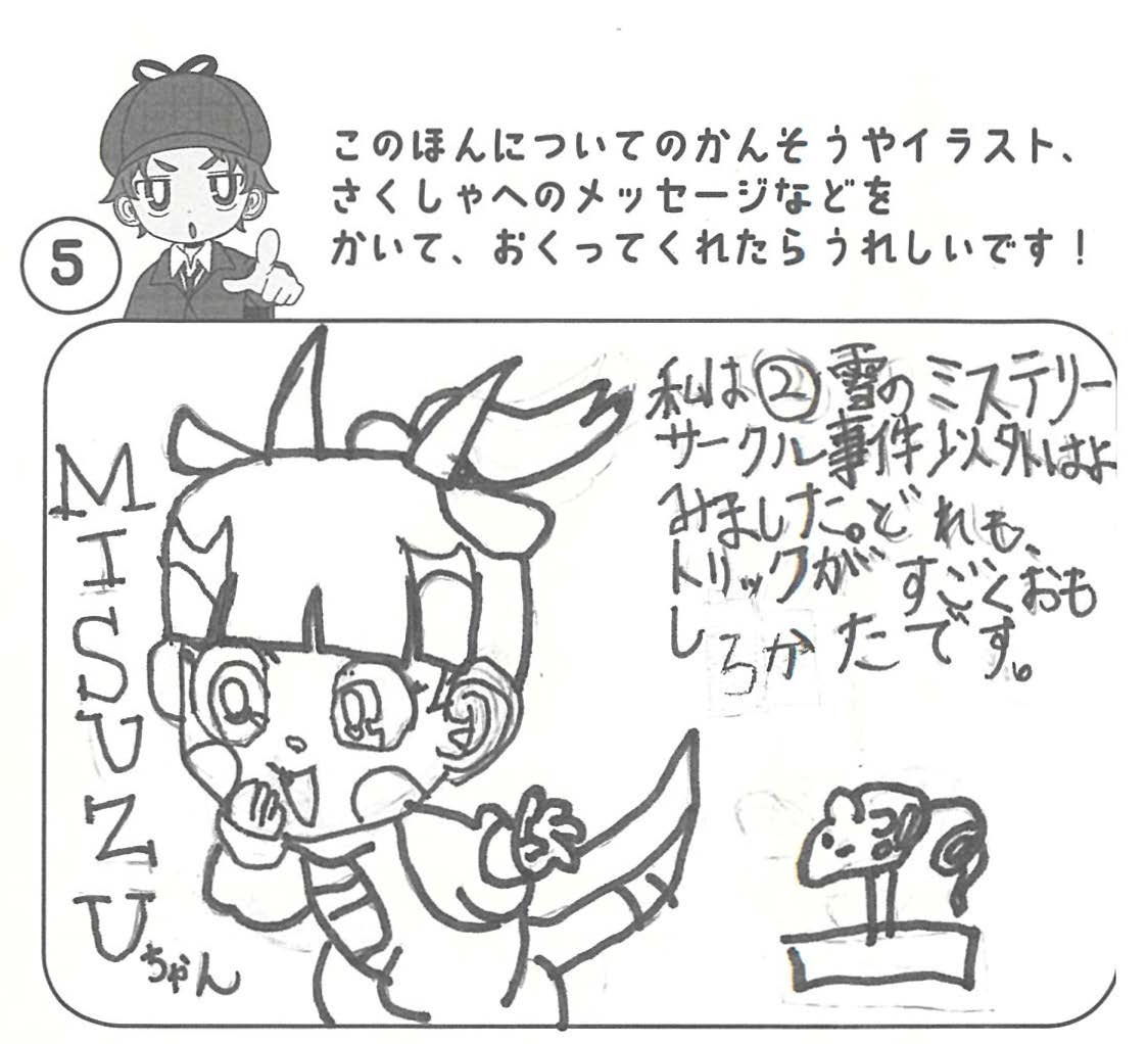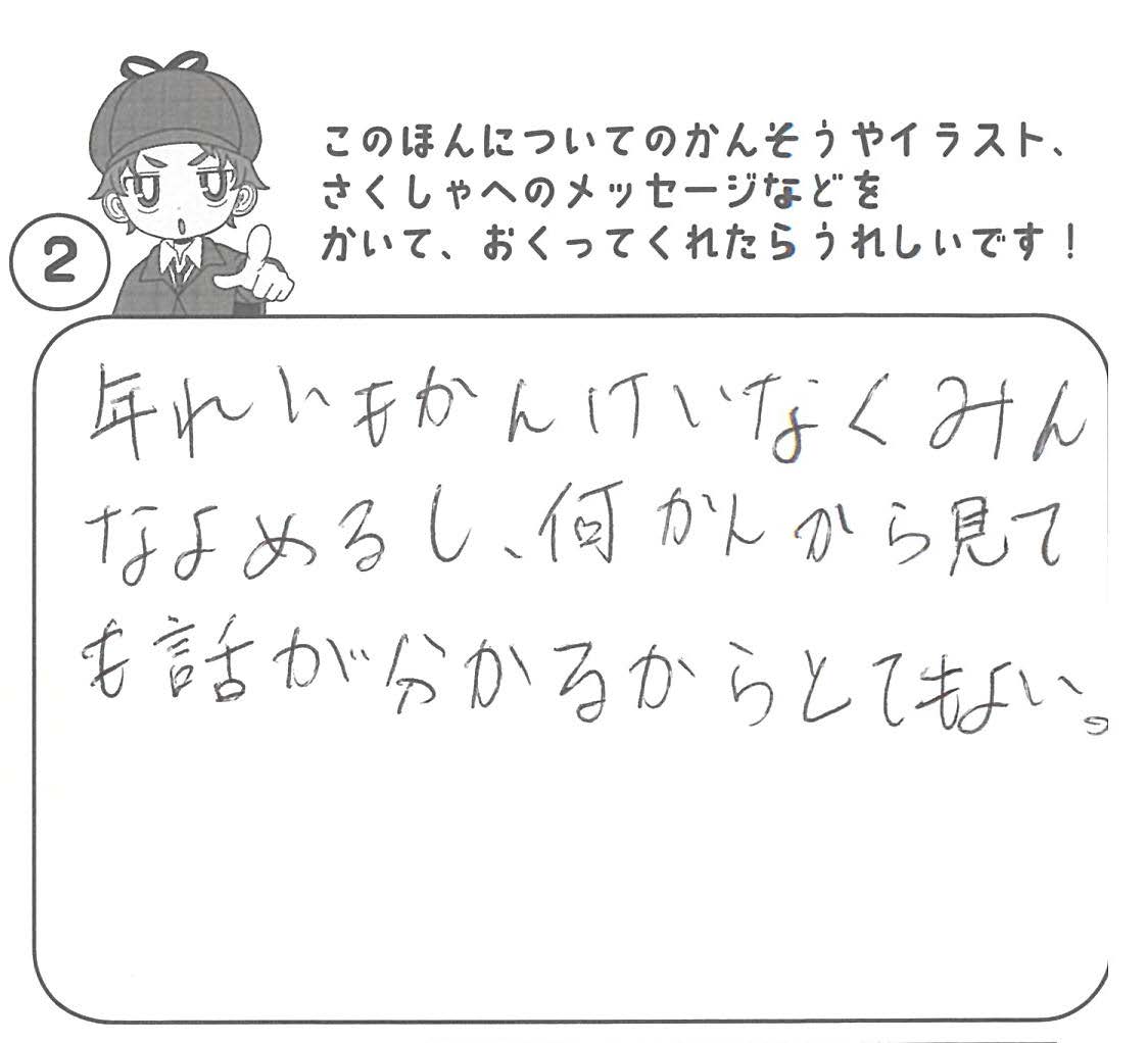 シリーズ予告もあり、嬉しいです。ミステリファンとしては、ゆくゆくは大どんでん返しや叙述トリックなども読めるだろうかとだいぶ先走った期待もしてしまいます。低年齢向けの児童書ではさすがに難しいかとも思いますが。