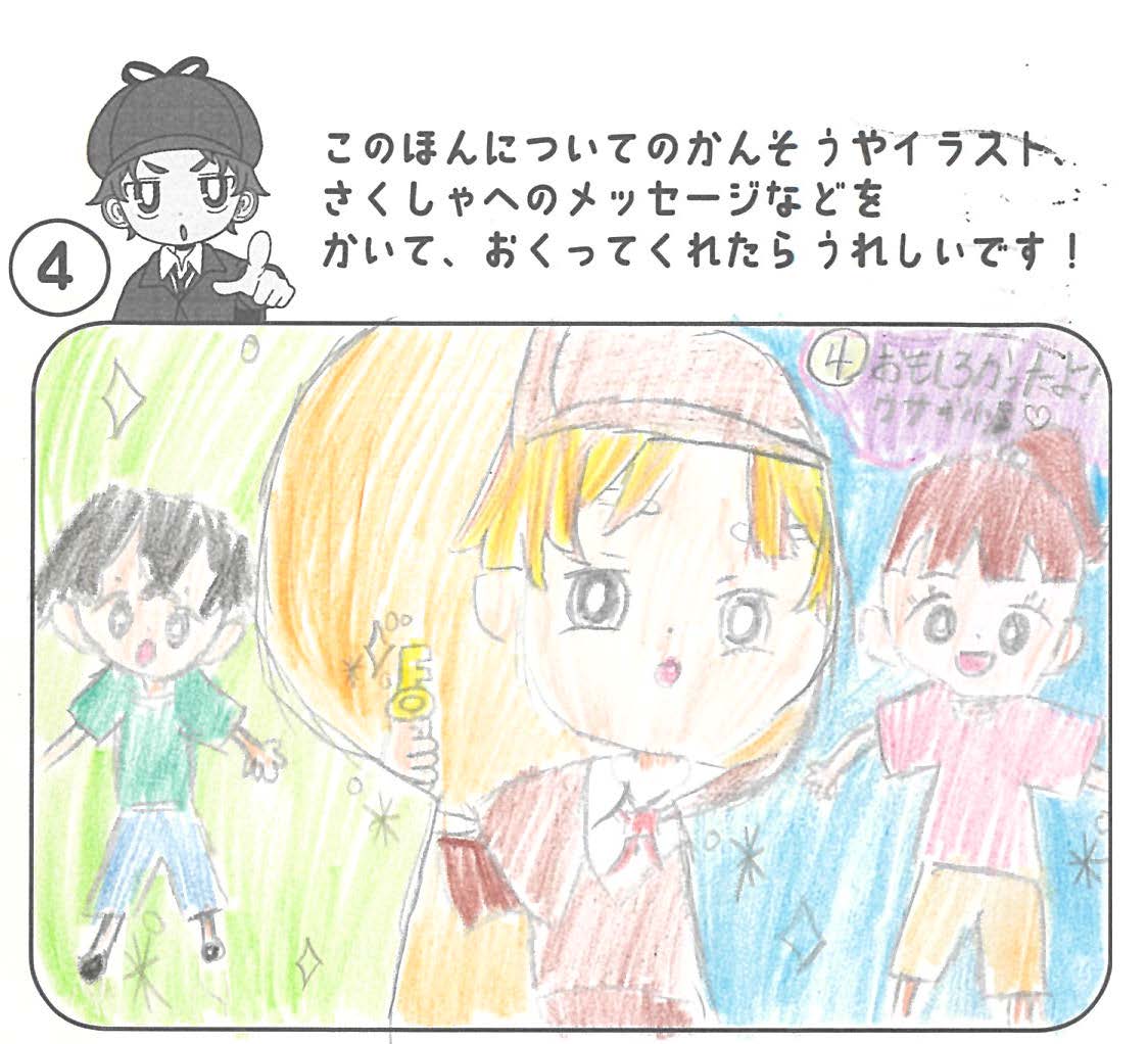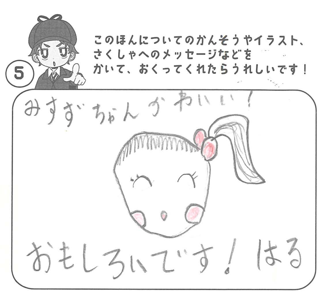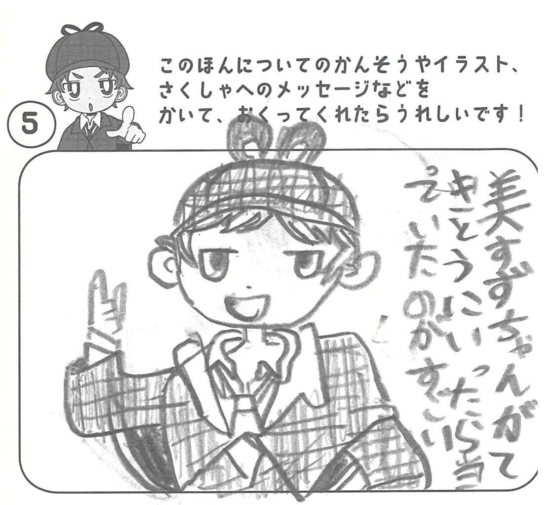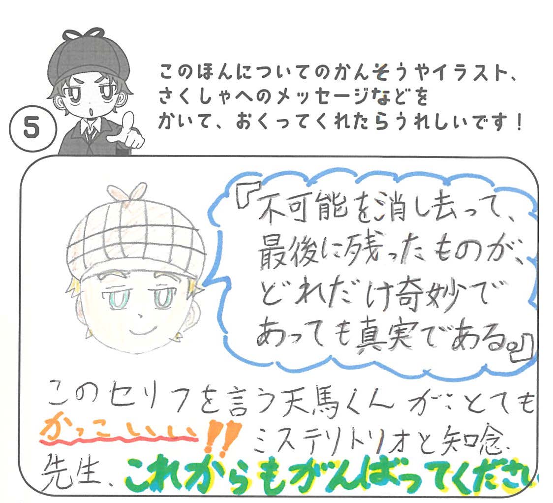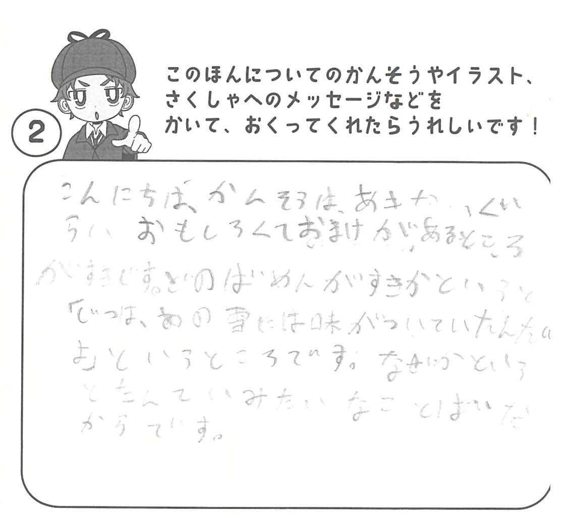 シリーズ予告もあり、嬉しいです。ミステリファンとしては、ゆくゆくは大どんでん返しや叙述トリックなども読めるだろうかとだいぶ先走った期待もしてしまいます。低年齢向けの児童書ではさすがに難しいかとも思いますが。