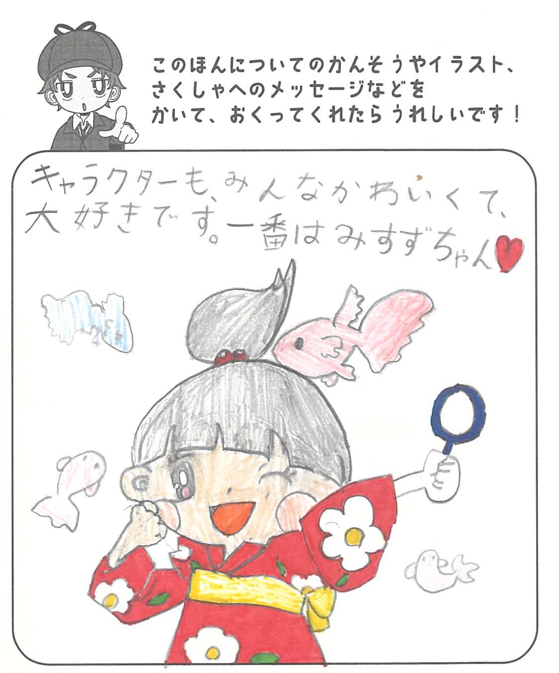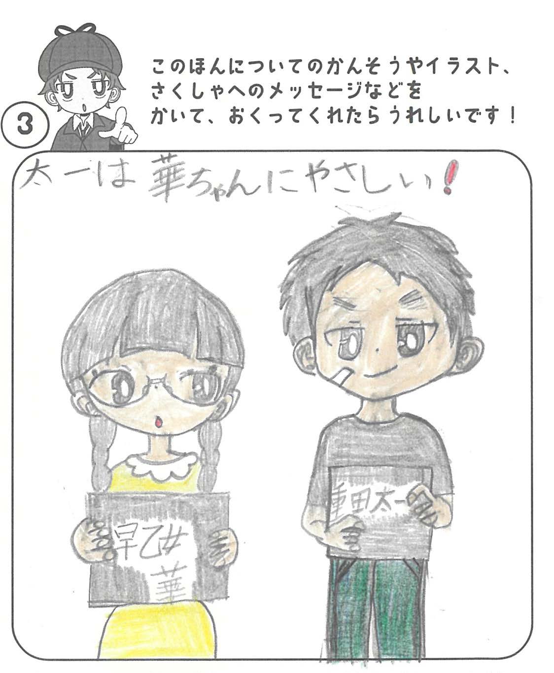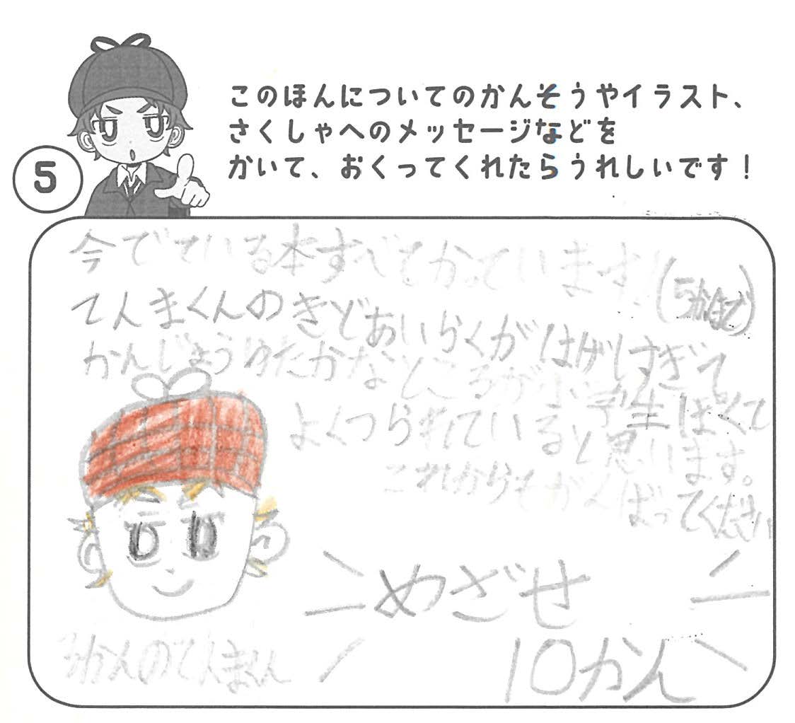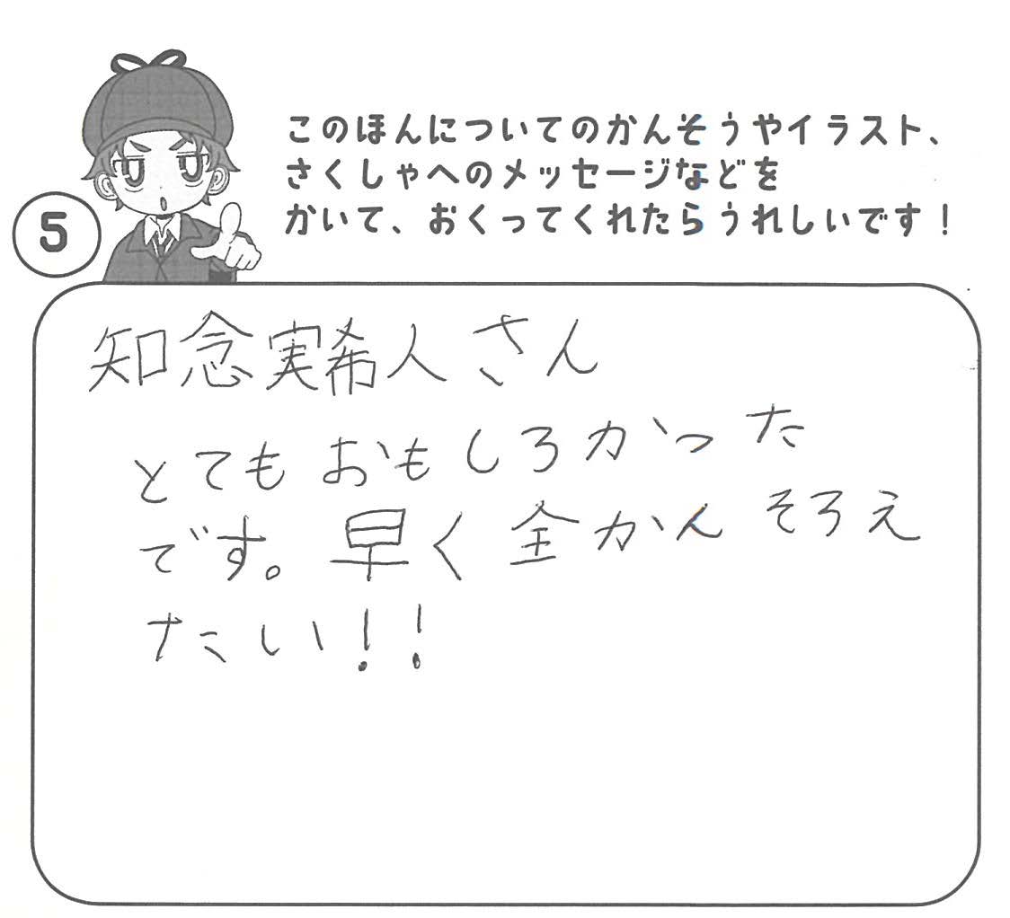 シリーズ予告もあり、嬉しいです。ミステリファンとしては、ゆくゆくは大どんでん返しや叙述トリックなども読めるだろうかとだいぶ先走った期待もしてしまいます。低年齢向けの児童書ではさすがに難しいかとも思いますが。